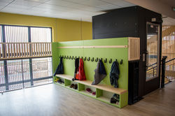 Si cet espace constitue le cœur dynamique du projet pour les petits et les grands, il laisse apparaître au R+1, une coursive ajourée en bois, qui semble suspendue à la charpente principale, et apporte aux plus grands, l'intimité et le calme, avant l'entrée en classe.